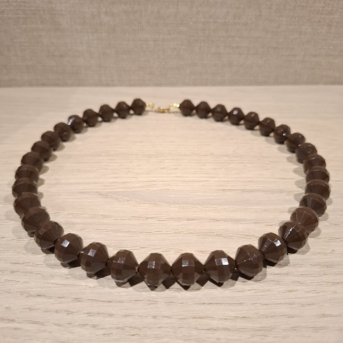 Dit collier is gemaakt van 12mm donkerbruine kunststof facetkralen (chocobruin)