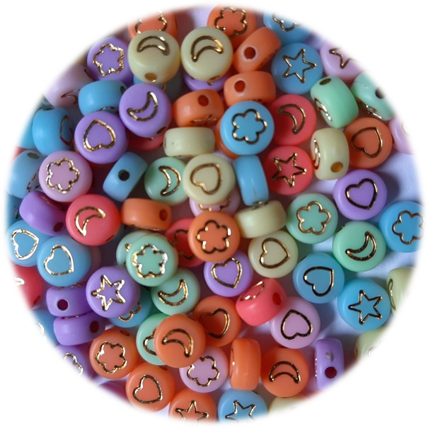 Kunststof Letterkralen Plat rond - 7x3.5mm – Pastel Kleuren met Goudkleur LettersKUNSTSTOF LETTERKRALEN PLAT ROND - 7X3.5MM – PASTEL KLEUREN MET GOUDKLEUR LETTERSPrijs is per ca 100 stuks